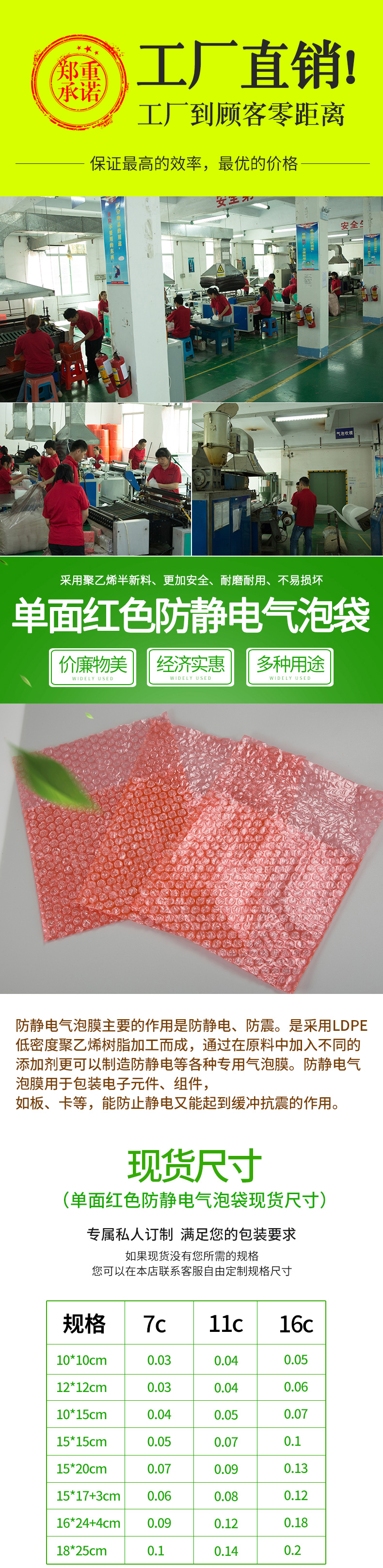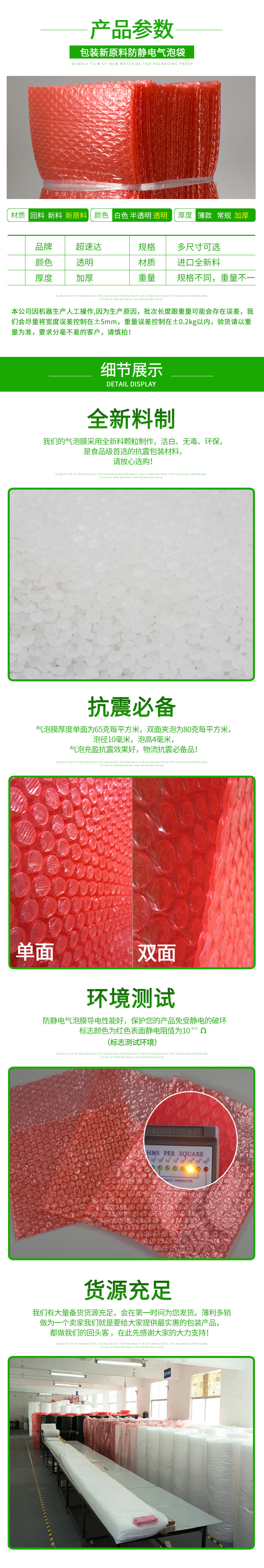 防靜電汽泡袋用于較輕產品和一般要求產品的包裝。其特性為通過這一密封氣囊達到防震緩 沖作用是一種成熟的包裝材料。防靜電氣泡袋,氣泡片可防止產品在生產搬運過程中因碰撞, 摩擦或靜電引起的破壞。