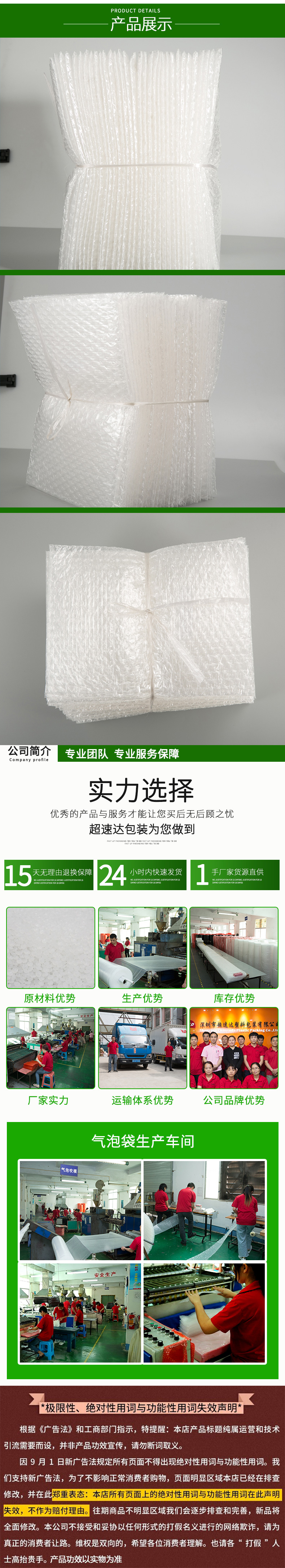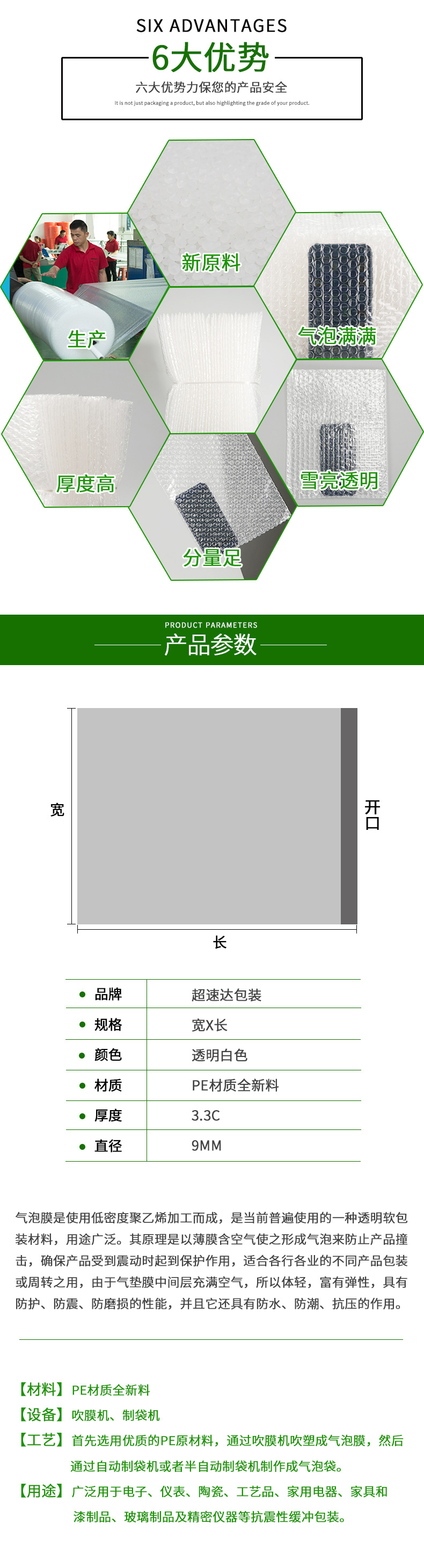 氣泡袋,又叫氣墊膜,氣珠膜,氣泡膜,氣泡紙,是采用LDPE低密度聚億烯樹脂加工而成。雙面氣泡袋防震力強適合體積較大較重之物品包裝。氣泡袋內附減震氣泡膜,氣泡膜中有無數小氣泡,所以體輕,富有彈性,具有隔音,防震防、防刮擦的功能,廣泛用于電子、儀表、陶瓷、工藝品、家用電器,自車行,廚房、家具、五金工具制品、玻璃制品及精密儀器等的抗震性緩沖、保護包裝。可以防止在傳遞過程中對物品的擠壓、震動及摩擦等,對怕擠怕壓物品具有一定的保護作用。雙面氣泡袋可設防靜電氣泡袋,以及不同顏色、印刷.還可復合其它材料增加保護性及美觀。主要產品有單面氣泡袋、雙面氣泡袋、加厚氣泡袋、紅色氣泡袋、白色氣泡袋、防靜電氣泡袋。