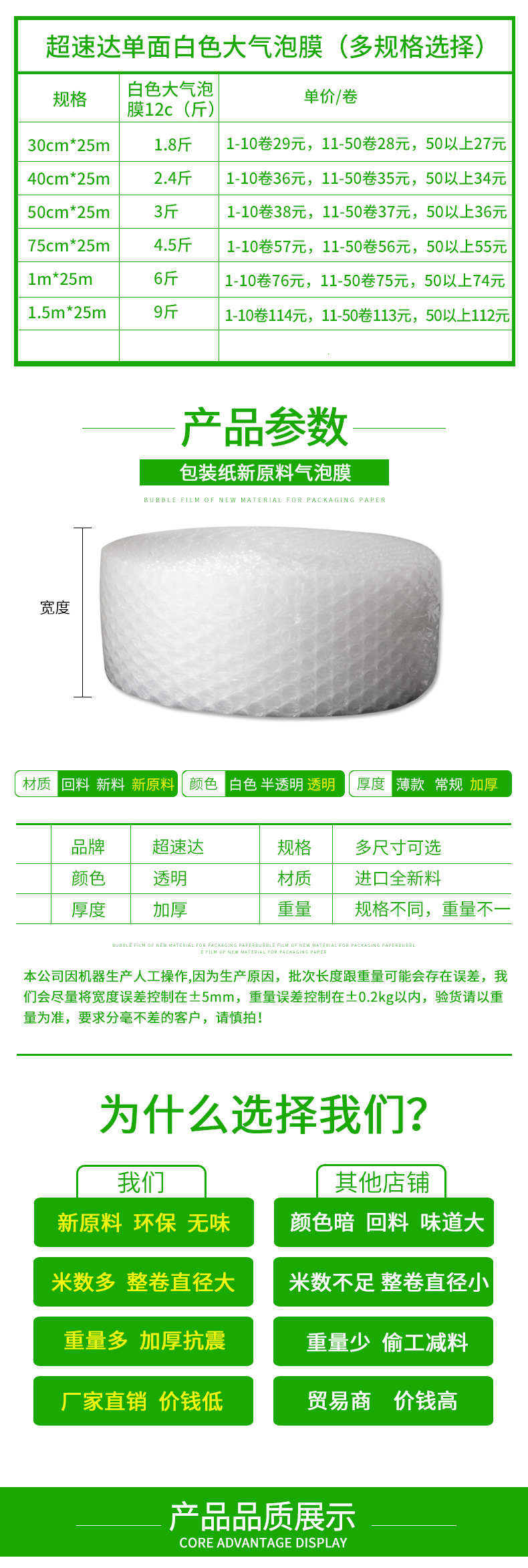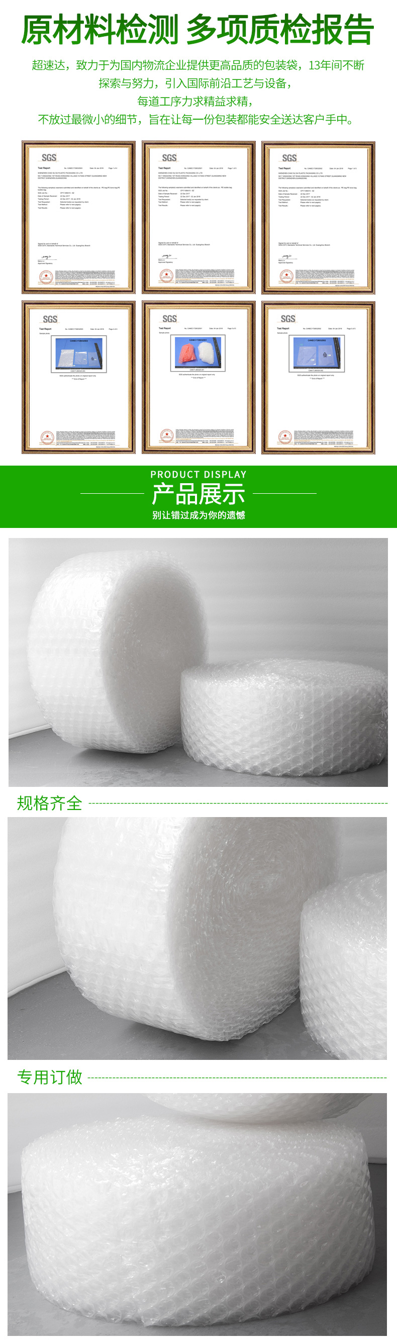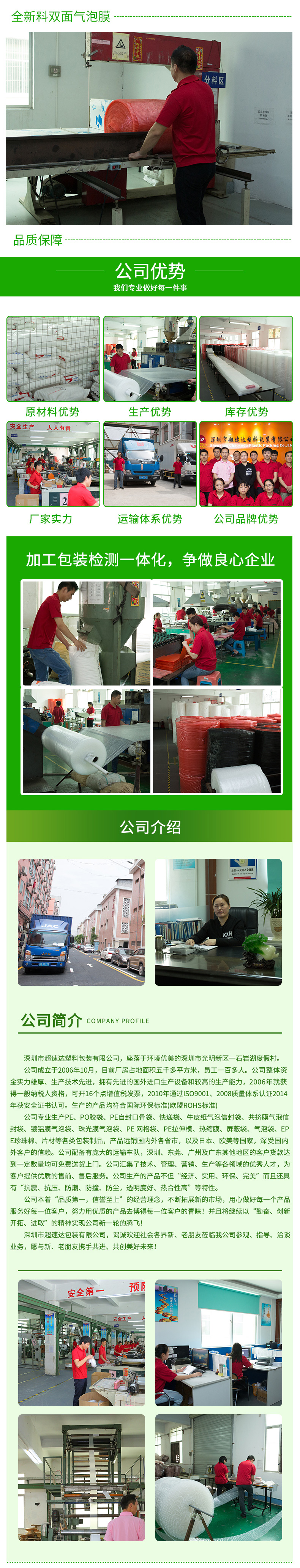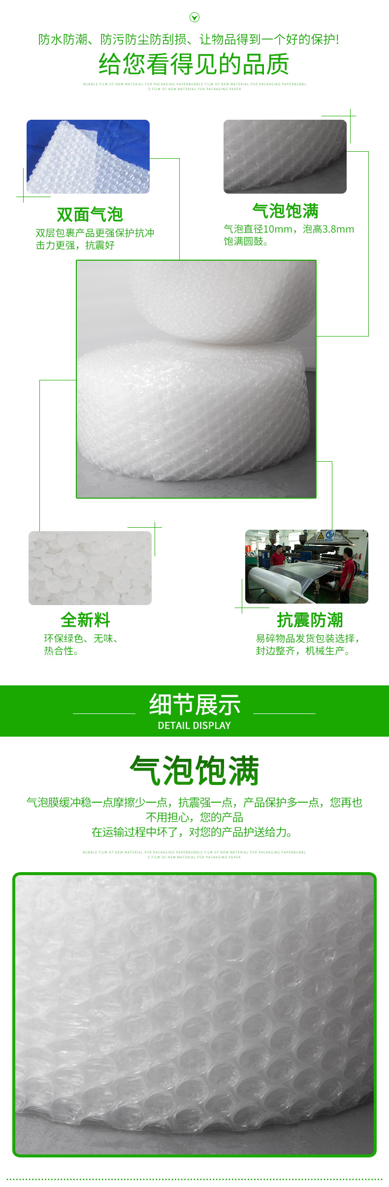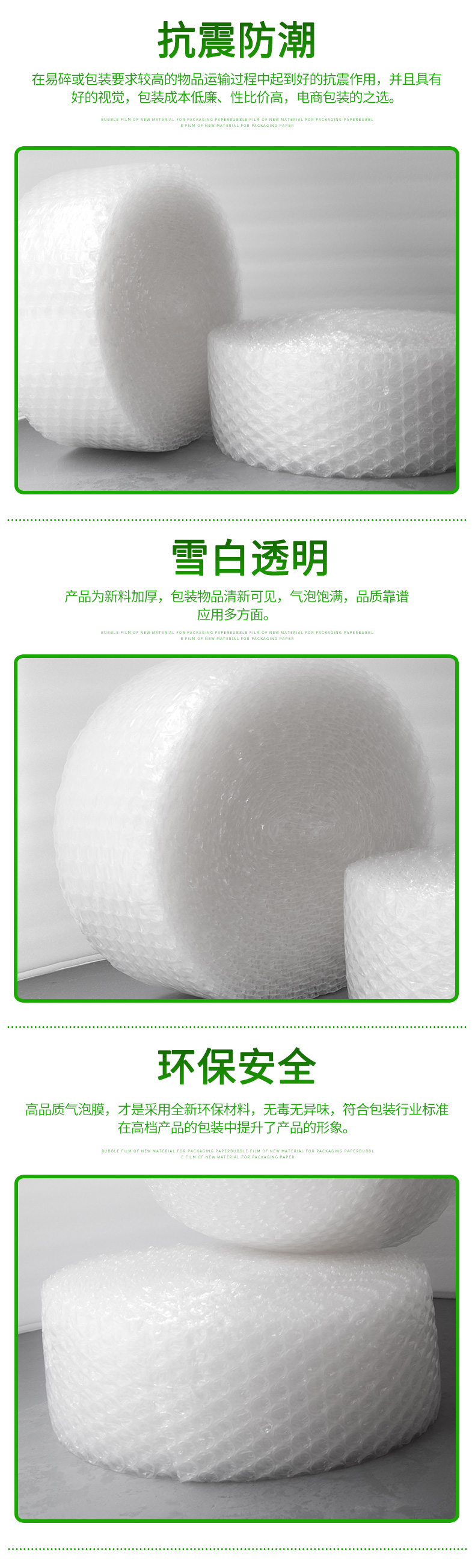采用聚乙稀PE原料,經(jīng)擠出雙層膜真空復(fù)合成型的氣墊薄膜(簡稱氣泡膜),產(chǎn)品主要用于儀表、儀器、易碎、易損物品的防震包裝及電子行業(yè)、食品、工藝品、五金、注塑件、日用品等行業(yè)的減震包裝,可生產(chǎn)單面、雙面氣泡卷材、成型袋,小泡φ5MM,普通中泡φ8MM,并可生產(chǎn)達(dá) φ30MM的超大氣泡膜,可生產(chǎn)防靜電氣泡袋,復(fù)合多種膜料的氣泡墊,以上產(chǎn)品均可著色。氣泡卷、氣泡膜、單面氣泡袋、雙面氣泡袋、加厚氣泡袋、紅色氣泡袋、白色氣泡袋、防靜電氣泡袋。